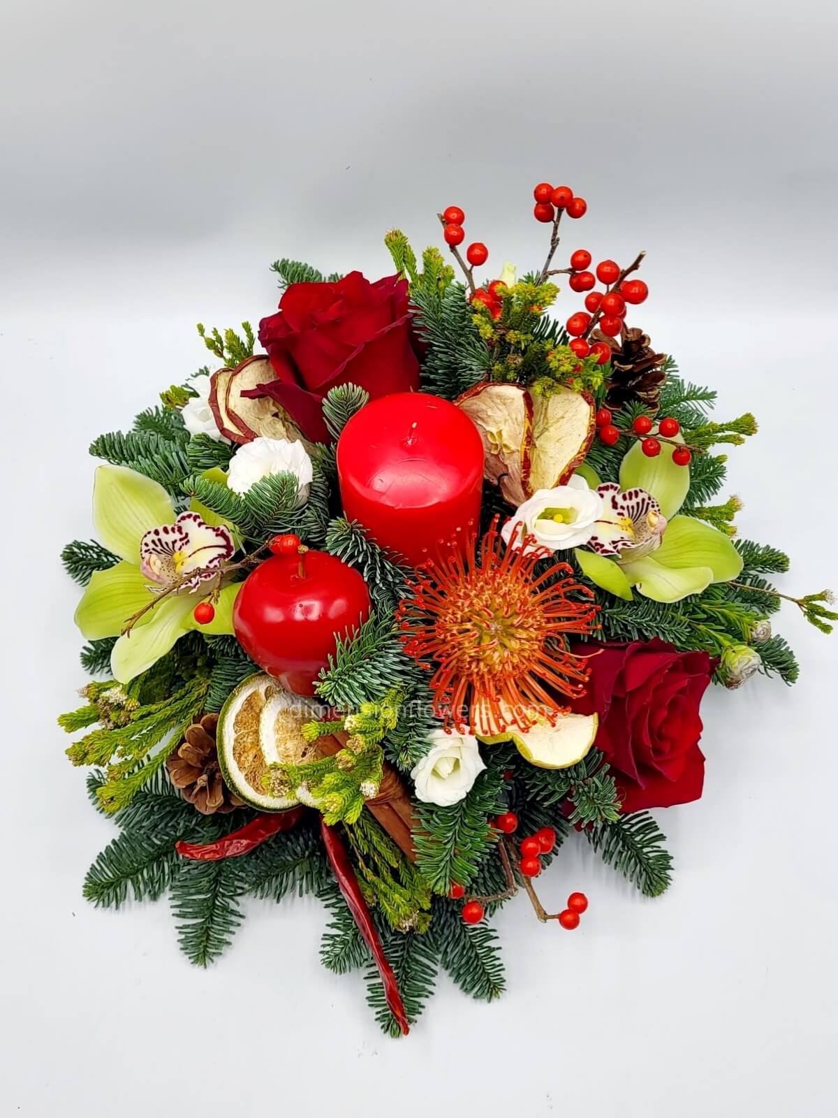 Centrotavola con candela, abete, orchidee, rose e frutta essicata LUXURY